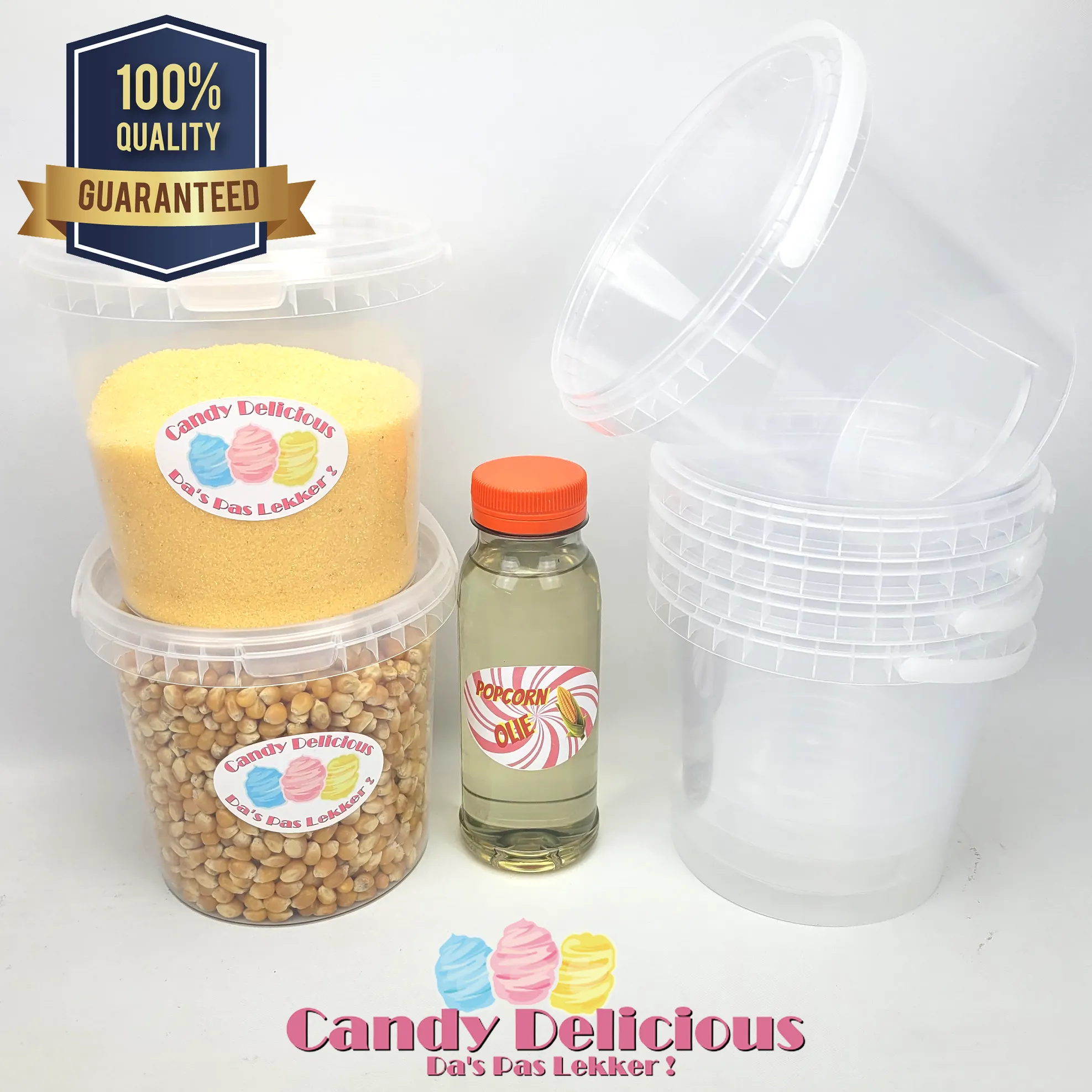 Inhoud van het pakket bestaat uit: 820 gram Maïs, 500 gram Popsuiker, 250ml Popcorn Olie en 5 emmertjes van 1 liter.
