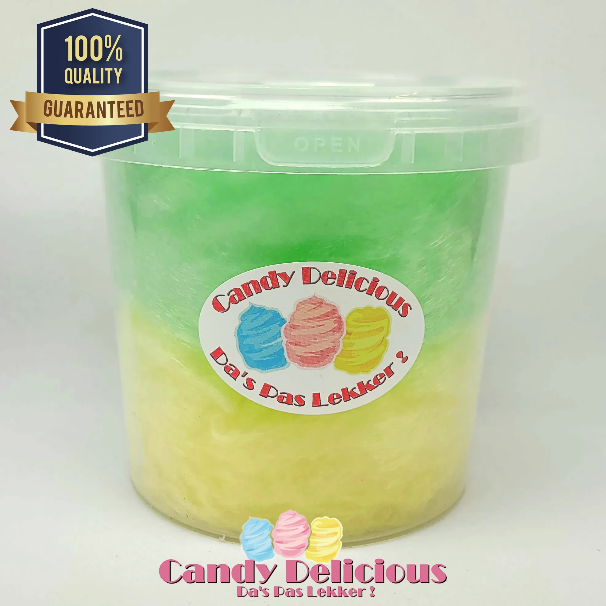 Emmer van 1 liter gevuld met Groene en Gele Suikerspin. Met de smaken Appel en Banaan.