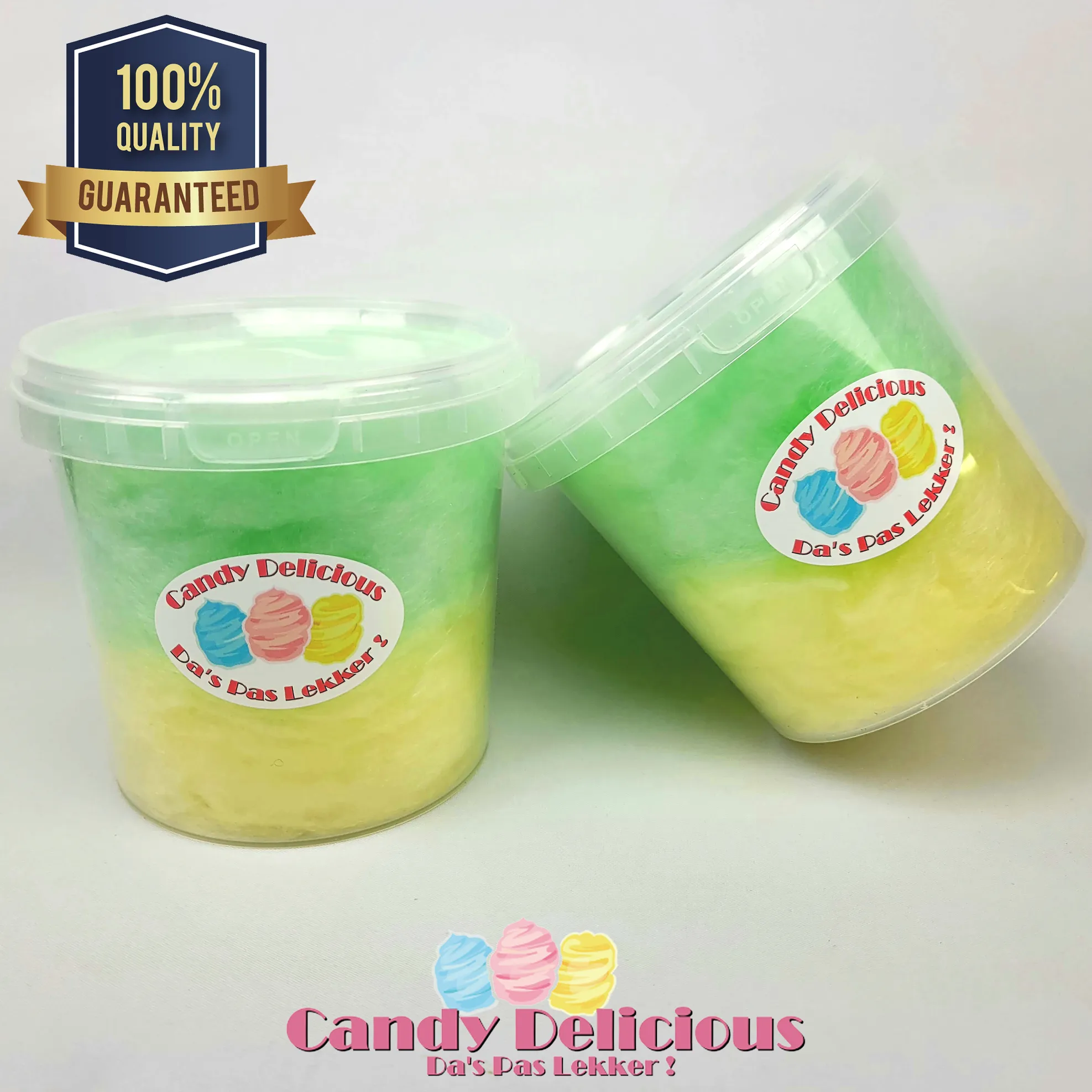 Emmer van 1 liter gevuld met Groene en Gele Suikerspin. Met de smaken Appel en Banaan.