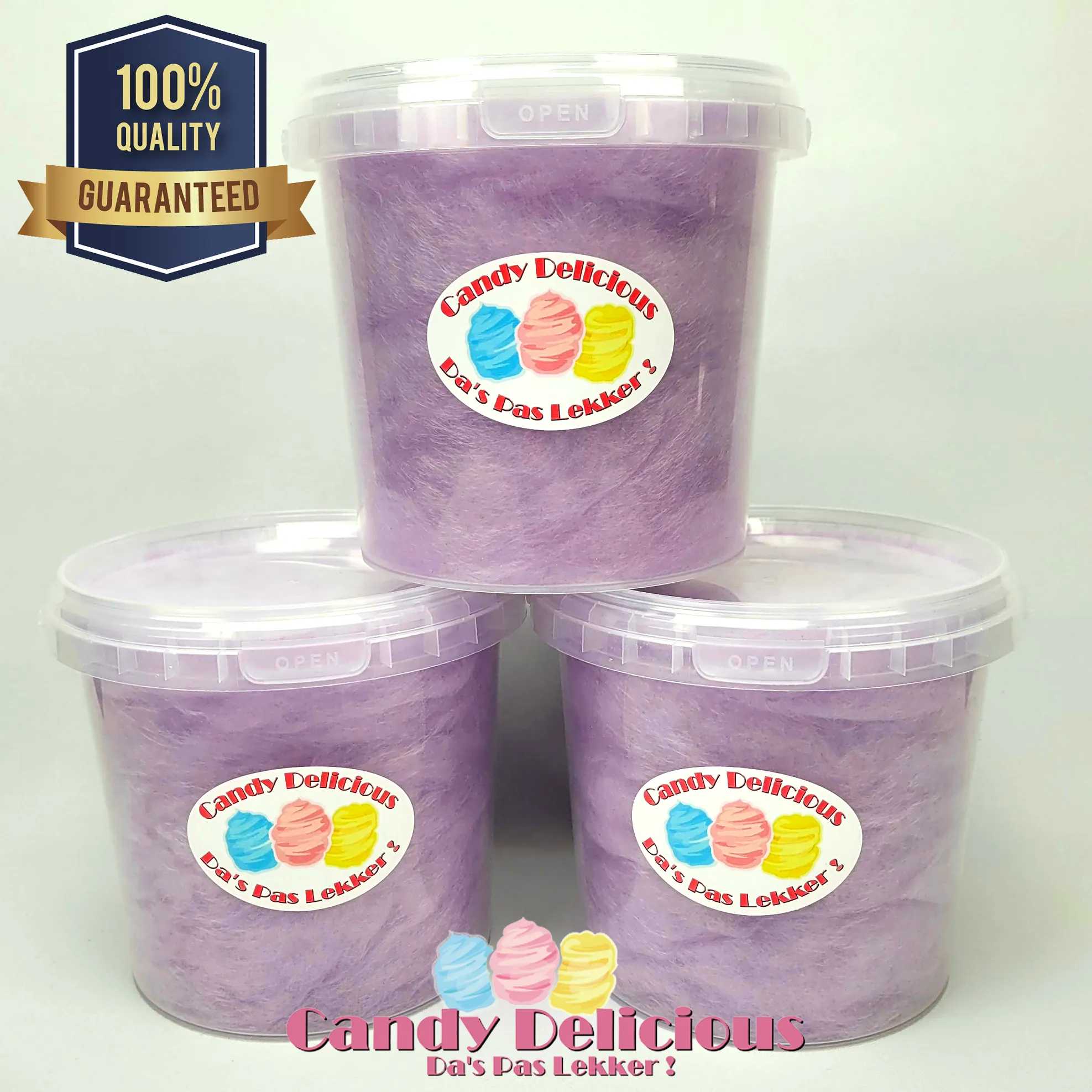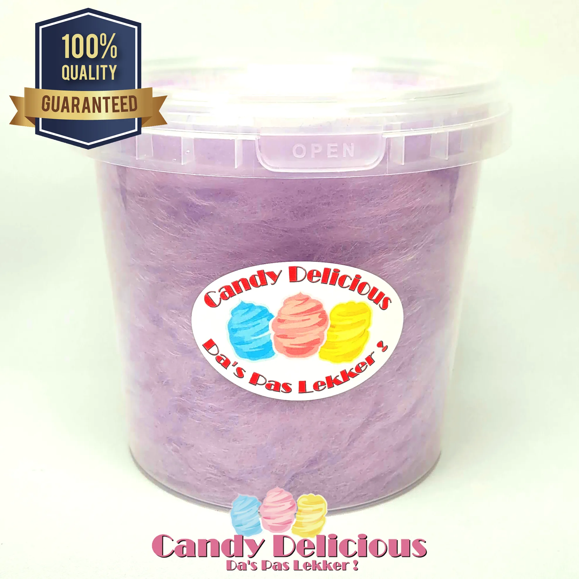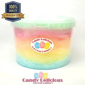 Onze suikerspin wordt verpakt in een stevige, hersluitbare emmer van 1 liter. Dit garandeert niet alleen optimale versheid, maar maakt het ook eenvoudig om te delen of te bewaren.
