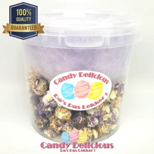 Emmer van 1 liter gevuld met 4 kleuren en smaken Suikerspin.