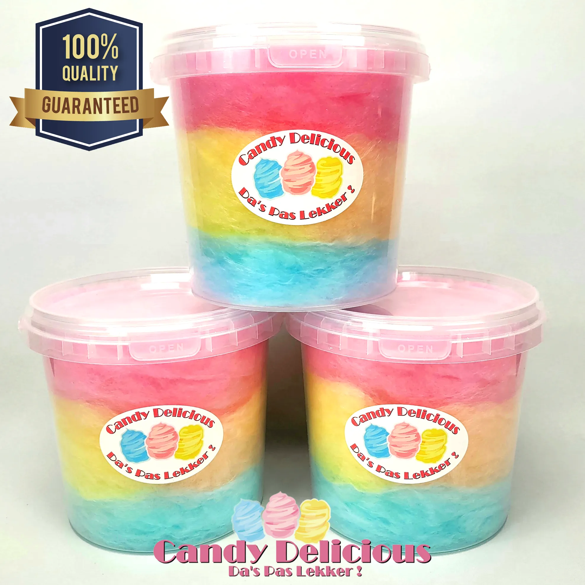 Onze suikerspin wordt verpakt in een stevige, hersluitbare emmer van 1 liter. Dit garandeert niet alleen optimale versheid, maar maakt het ook eenvoudig om te delen of te bewaren.